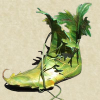 Calzature realizzate interamente in foglia lavorata secondo lo stile elfico, in grado di rendere la parte vegetale duratura nel tempo. La suola è di corteccia lavorata avvolta in delicata pelle rendendola comoda e resistenze al sottobosco; i lacci di erba intrecciata le assicurano alle caviglie.