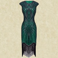 Vestito da cerimonia lungo fino ai piedi senza maniche. Aderente al corpo per accentuarne le forme, di colore verde con ricami eleganti di tonalità più scura. Dal ginocchio alle caviglie il vestito presenta un ricamo nero verticale a frange sottili creando onde eleganti ad ogni passo. Utilizzato per feste, cerimonie o eventi importanti.